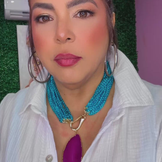 Este hermoso conjunto de collar y pulsera cuenta con una piedra ágata fushia con boldes dorados montada en una cadena en contraste que le da un toque exclusivo. Ideal para complementar cualquier atuendo con elegancia. ¡Obtén un 100% de estilo con este conjunto de piedra natural!
