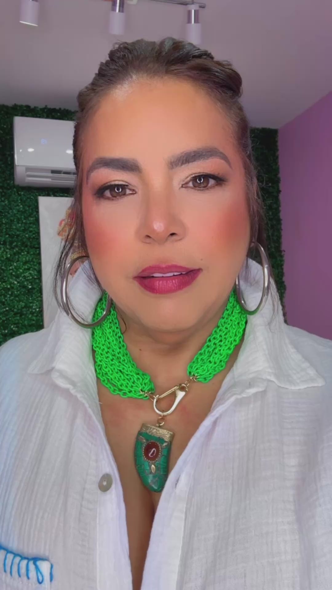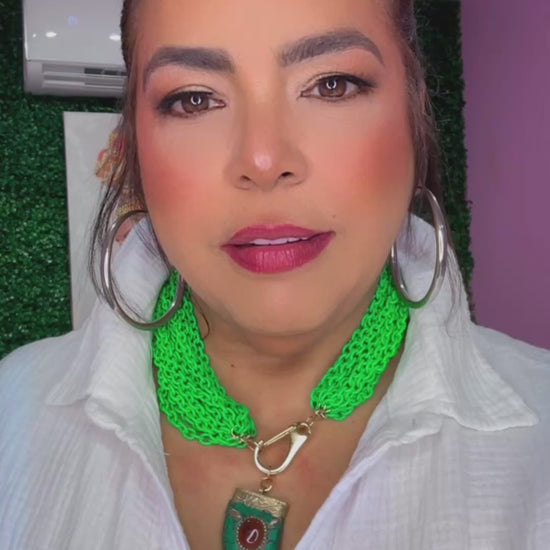 Su tejido de cadenas en verde intenso representa el crecimiento, la vida y la conexión con la naturaleza. En el centro, un colgante tipo amuleto con detalles artesanales transmite poder, protección y personalidad.